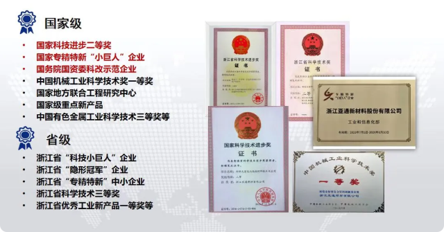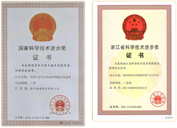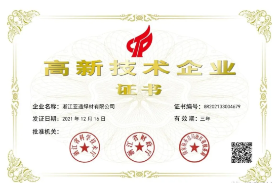 The company has obtained certifications including ISO9001:2015 Quality Management System, ISO14001:2015 Environmental Management System, ISO45001:2018 Occupational Health and Safety Management System, IATF 16949:2016 Automotive Quality Management System, and Enterprise Safety Standardization Production Level II Certification. It has presided over or participated in the formulation of over 40 national or industry standards and possesses over 50 authorized national invention patents. Related achievements have been awarded the National Science and Technology Progress Second Prize, National Key New Product Certificate, Machinery Industry Science and Technology First Prize, Zhejiang Province Science and Technology Progress Award, among others. Related R&D projects have been included in the National Torch Program and National Innovation Fund projects. The company and its products have been honored with titles such as Top Ten Enterprises in China's Solder Industry, Zhejiang Famous Brand Product, Zhejiang Excellent Sci-Tech Product, Hangzhou Famous Trademark, Hangzhou Innovative Pilot Enterprise, Hangzhou Civil-Military Integration Demonstration Enterprise, and Hangzhou Patent Demonstration Enterprise.
