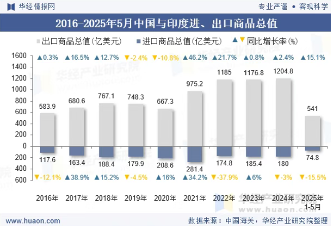 China's exports to India have also continued to grow steadily. In 2024, trade between China and India reached $138.48 billion, with exports to India amounting to $120.481 billion, a year-on-year increase of 2.4%. India has quietly become the fifth-largest destination for China's exports (following the United States, Vietnam, Japan, and South Korea), far surpassing traditional trade partners such as Russia, Germany, and Italy. Particularly from January to May 2025, trade between China and India reached $61.58 billion, a year-on-year increase of 10.3%, with exports growing by 15.1% to $54.1 billion, indicating a further acceleration in growth momentum.