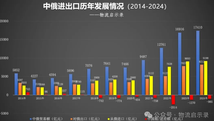 Over the past fifteen years, China has consistently remained Russia's largest trading partner, while Russia ranks as China's fifth-largest trading partner. Moreover, bilateral trade between China and Russia has set new records year after year. According to statistics, from 2014 to 2024, the scale of China-Russia bilateral trade increased by 3.0 times, with China's exports to Russia growing by 2.5 times and imports from Russia expanding by 3.6 times. Looking at the trade volume over the past three years, China-Russia bilateral trade has achieved leapfrog growth, increasing by 2.3 times during this period: in 2022, China-Russia trade amounted to $190.2 billion; in 2023, it rose to $240.1 billion; and in 2024, it reached a new high of $244.8 billion despite headwinds, marking a 2.3-fold increase compared to 2022.