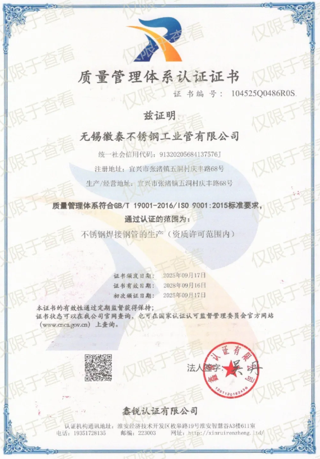 Wuxi Weitai Stainless Steel Industrial Pipe Co., Ltd. was established in 2012. The factory is located in the Yixing Tourism Resort in Jiangsu Province, with a workshop area of 10,000 square meters. It produces industrial-grade pressure-bearing stainless steel welded pipes, titanium welded pipes, internal threaded pipes, external threaded pipes, water expansion pipes, fluid pipes, and other products. The company has set up a sales office and warehouse in Wuxi, Jiangsu Province, stocking a large inventory of stainless steel supporting products for customers' integrated procurement needs. The product range includes stainless steel plates such as 304, 316L, 2205, 2507, and 310S, as well as stainless steel profiles and fittings like angle steel, flat steel, channel steel, round bars, elbows, and flanges. Processing services include stainless steel shearing and bending, laser cutting, waterjet cutting, plasma cutting for circles and squares, among others.