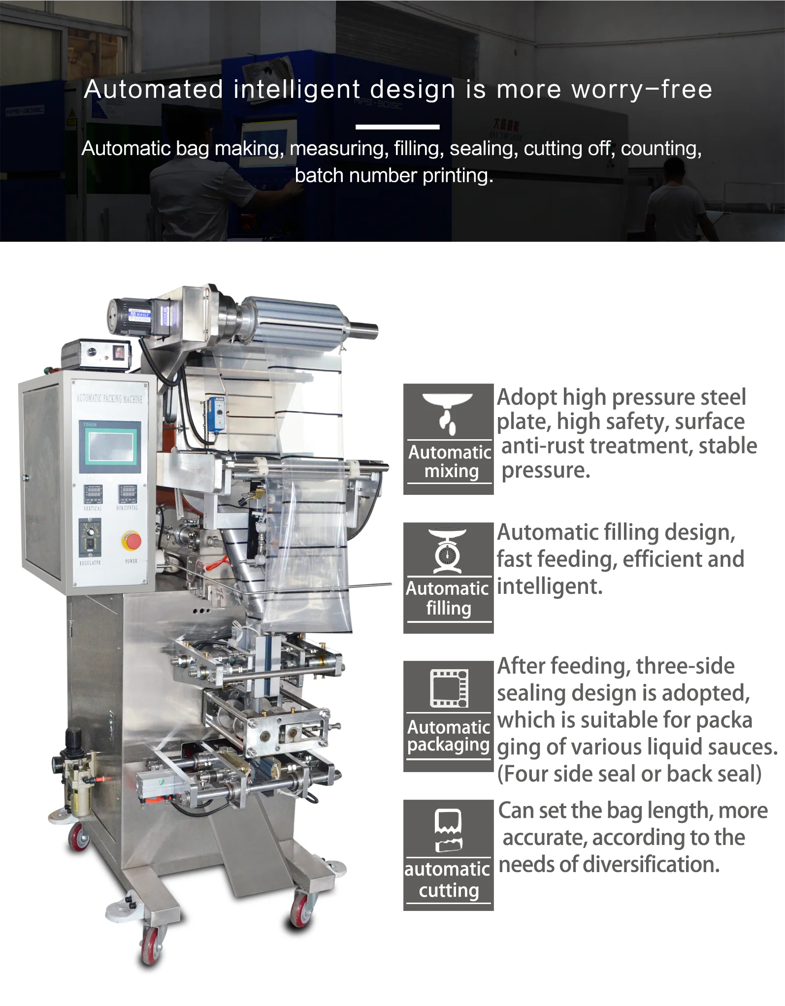 SJIII-S Series Paste-State Packaging Machine adopts Computer Controll System completly, it can finish the production's process automatically such as making bags, counting, filling, sealing, cutting, printing batch number, making the rip, and so on. It also adopts the adjustable quantificational plunger pump, and it special uses for something which easy to drawbench or dript as shampoo.
