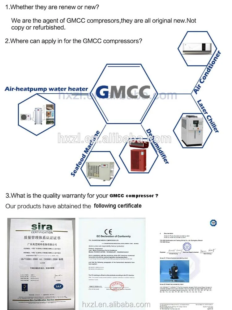 We are also the sale agent of GMCC original rotary compressors,which have DC inverter compressors,high efficiency fixed frequency compressors,Tropical Type compressor,water heater compressor,ect. They are widely using air conditioner,water heater, humidifier,Dehumidifier,seahoodmachine,ect. If you are interested in our products, welcome you inquiry.