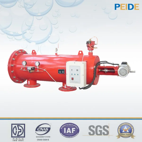 Fisrt,the water enters into the coarse strainer(witch is in order to prevent fine strainer).Then water enters into the fine strainer,Impurities will accumulate in the internal of fine strainer,When the pressure differential between water inlet and outlet reaches to pre-setting value,the motor will wrk automatic.The motor will drive coupling rod rotating and in vertical direction.The sucking nozzle will suck the impurities from the internal surface of fine strainer,Last the impurities will be drained by automatic drain valve.The system's water do not need stop in cleaning process.